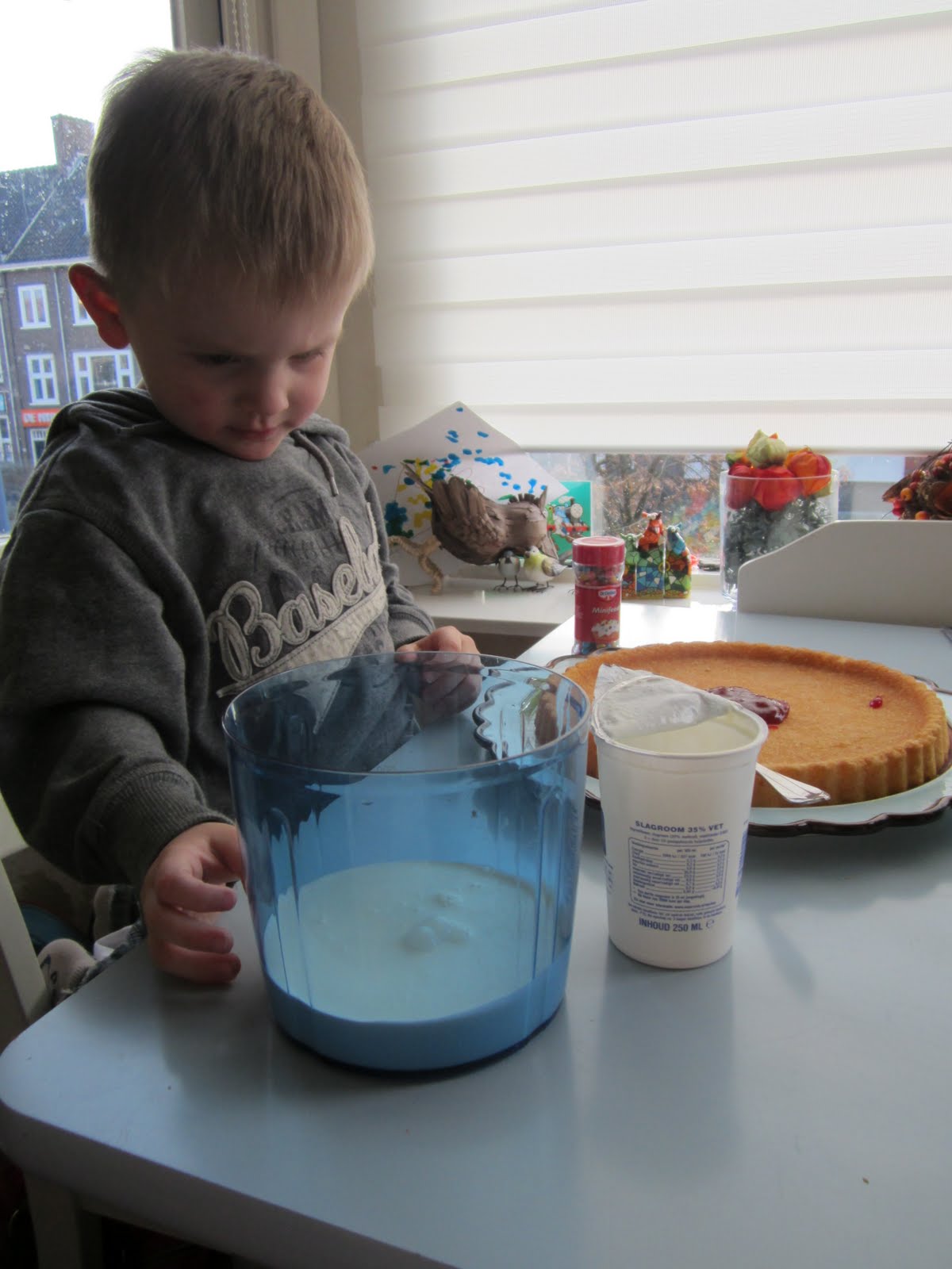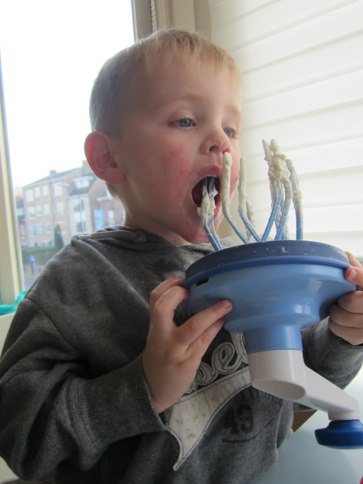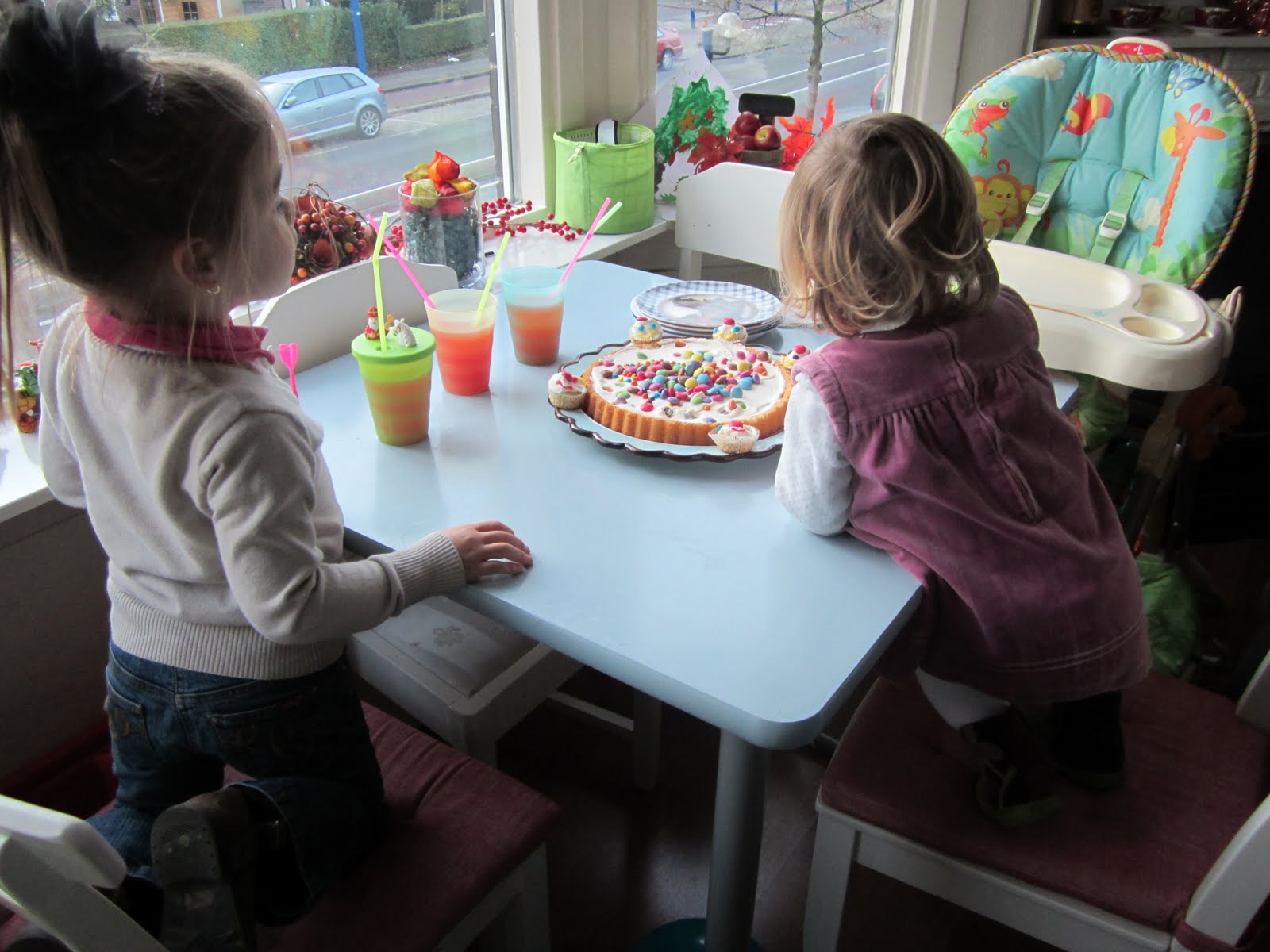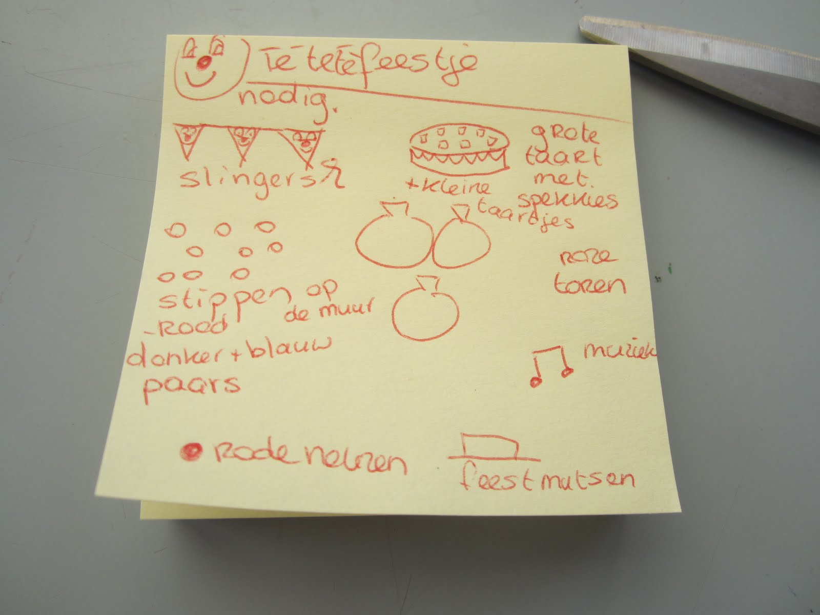 Na de lunch vroeg ik Ewan of hij het leuk vond om een feestje te vieren. Hij zei natuurlijk ja! Ik vroeg hem wat voor feestje. Hij antwoordde ‘een Tetete-feestje’ (Jokie van de Efteling). Daarna vroeg ik hem wat we daar allemaal voor nodig hadden. Hij kwam met hele goede dingen als: een tetete-slinger, gekleurde stippen, een grote taart met spekkies, maar ook kleine taartjes, feestmutsen en een roze toren(?). Ik heb hem nog wat op weg geholpen met ballonnen, muziek en rode neuzen en toen was onze brainstormsessie klaar 🙂