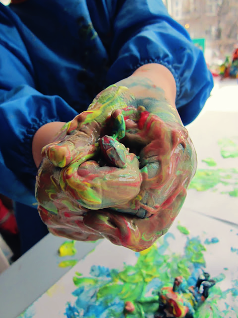 Maar al gauw vond Ewan het leuker om gewoon de hele poppetjes met verf in te smeren: