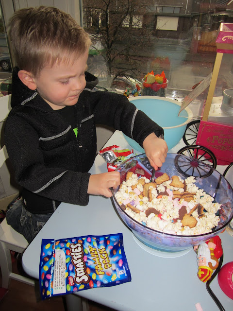 Ewan heeft in de pan met karamel geroerd. Het was de eerste keer dat hij in een hete pan mocht roeren. De popcorn is wel lekker geworden, maar smaakte anders dan karamel popcorn die je in de kant en klaar in de winkel koopt. Ik denk dat dat kwam door de pancake syrup. De volgende keer wil ik het proberen met gewone stroop, gewone suiker en zonder het zuiveringszout. Maar we zijn lekker de hele middag bezig geweest.