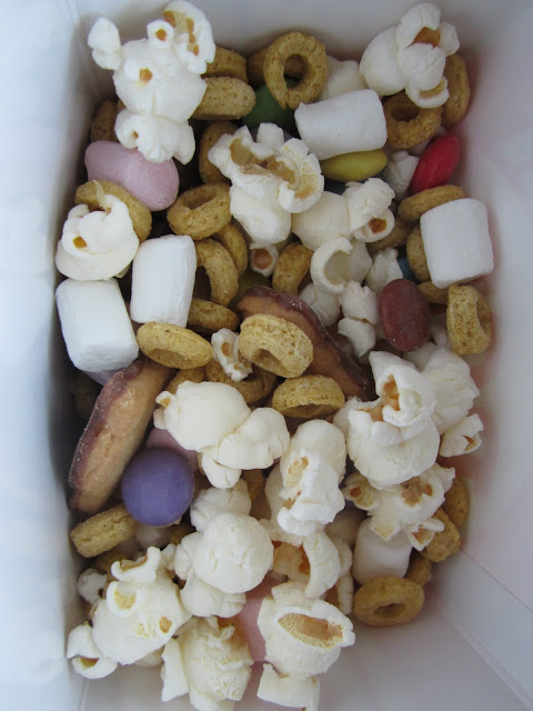 Voor de winter snack mix hebben we dus popcorn, honey loops, smarties, mini marshmallows en kleine beestenkoekjes gemengd.