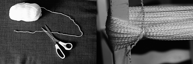 Knip steeds een stukje draad van ongeveer 20 cm en bind dat stevig om de 150 draden heen. Hiervoor kun je het beste het kleine stukje draad twee of drie keer om de draden wikkelen en het vastmaken met een dubbele knoop.