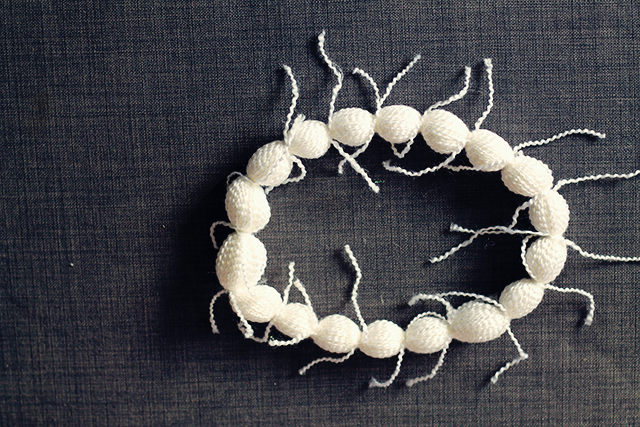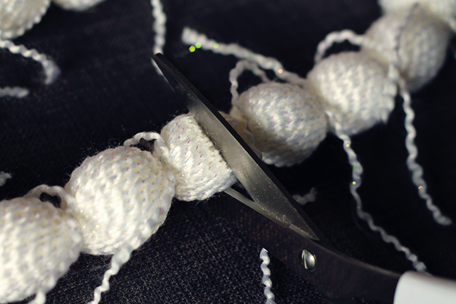 Maak er balletjes van door de draden flink door elkaar te aaien en knip te lange draden af. De mooiste pompons krijg je als je rondom het hele balletje nog even bijknipt.