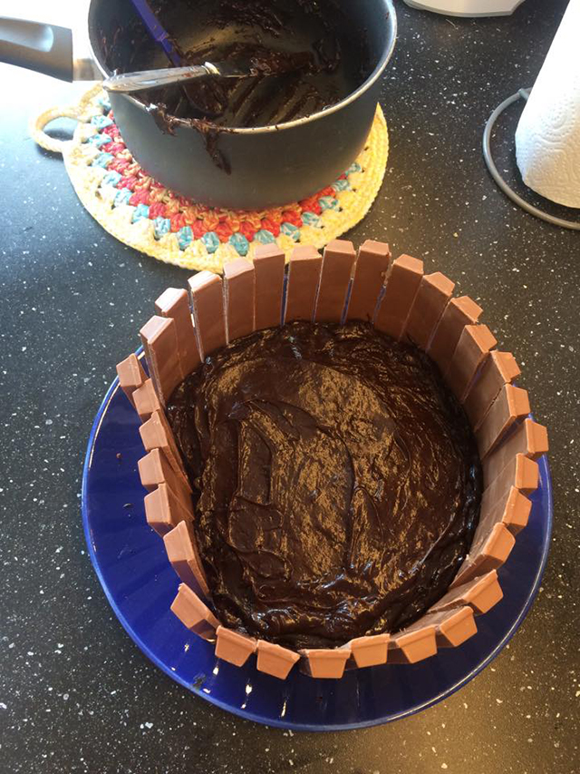 Ik verwachtte bij deze pin een goed resultaat; ik bak en versier regelmatig taarten en deze zag er makkelijk uit. Het ‘vastplakken’ van de Kitkats leek me het moeilijkst. Het plan was om een chocoladetaart te bakken, die te vullen met jam en slagroom en de Kitkats vast te plakken met chocoladepasta of glazuur. Om wat tijd te besparen besloot ik te kiezen voor een kant-en-klaar bakpakket van Dr. Oetker.