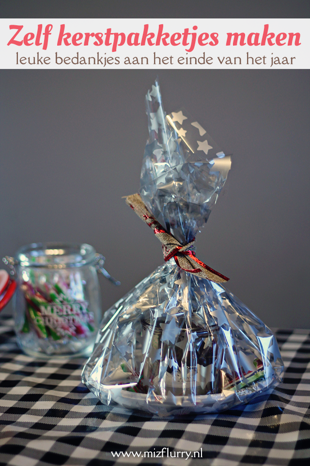 Je hebt in ieder geval iets nodig om de spulletjes in te stoppen. Ik koos voor wat diepere plastic bordjes (Kruidvat) verpakt in cellofaan met zilveren sterren (HEMA). Bij de Action kocht ik breed jute lint met rode glitters erop in een winters patroon. Voor in de pakketjes kocht ik waxinelichthouders voor grote waxinelichten (Action), kerstzuurstokjes (ook Action), kleine kerstchocolaatjes (HEMA), winter glow thee (supermarkt) en bakjes en bekertjes (Action) voor de zelfgebakken kerstkransjes (ik gebruikte dit recept, maar dan met bruine basterdsuiker). De waxinelichten had ik toevallig nog in huis. Ik wilde de pakketjes nog verder opvrolijken met kerststerren van papieren, maar dat is er helaas niet van gekomen. Niet afgebeeld op de foto, maar wel toegevoegd aan de pakketjes: een zelfgemaakte hanger van gekleurd zoutdeeg.
