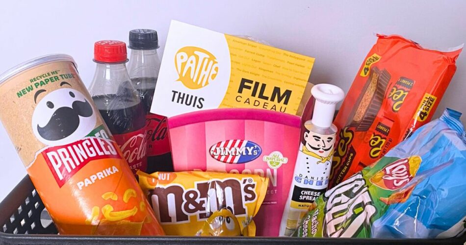 Geef een bon voor een film, bijvoorbeeld van Pathé thuis, en pak deze leuk in met allerlei bioscoop snacks, zoals popcorn, M&M’s, nachos, Buggles met Danisch chef, ander snoep en wat te drinken.