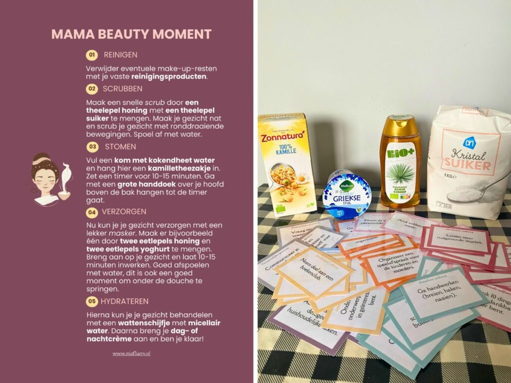 Maar ook in de supermarkt kun je hiervoor slagen. Geef bijvoorbeeld honing en suiker voor een DIY scrub en kamillethee voor een lekker stoombadje voor het gezicht. En met Griekse yoghurt en de honing kan een eenvoudig gezichtsmasker gemaakt worden. Voeg deze instructies toe om het cadeau compleet te maken: mama beauty moment. Eventueel kun je deze zelfzorg-ideeënkaartjes voor moeders ook nog toevoegen.